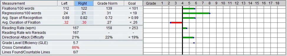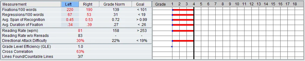 His parents are well educated and have been seeking help for him from the beginning. The help he received through the school district and tutors has not led to significant gains for him. He loses his place and tires easily while reading. He has difficulty identifying words and often has reading errors such as adding, omitting, substituting, and transposing words. As a result, he is a slow reader and his reading comprehension is not great. Although he never complained about his vision and passed the vision screening at the pediatricians office, his parents were unaware that he was farsighted and would benefit from reading glasses. While reading glasses were necessary to relieve strain on his eyes, it didn’t improve his tracking and word recognition skills.