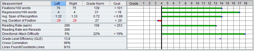 After enter the Reading Without Limits program for only 4 months he advanced his reading speed from 125 to 286 words per minute with the tracking ability of a freshman in college. His reading comprehension jumped to the high school level.