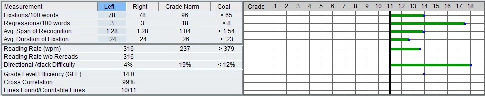 The school didn’t have any good remediation resources, but was willing to provide accommodations with a written recommendation by a specialist. The school thought LM might have a vision processing disorder contributing to her reading disability. After an assessment, it was determined that LM had reading difficulty due to a combination of visual and cognitive processing problems. She exhibited traits that are common in patients with Dyslexia. She was prescribed reading glasses to relieve her eyestrain and headaches. Then she entered the Reading Without Limits program which reprogrammed her visual and cognitive processing skills. Through as series of drills that reprogrammed her visual and cognitive processing she overcame her disability. In about 3.5 months she achieved huge gains in her read ability, which included a reading speed increase from 167 words per minutes to 316, and a reading comprehension jump of 70% to 90% accuracy.