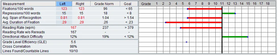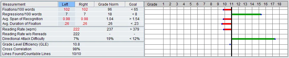 LM is a 16 yr old girl attending 11th grade at a high school outside the local school district. She has been a slow reader with poor reading comprehension since grade school. She doesn’t like to read and gets both eyestrain and headaches while reading. She also loses her place while reading, transposes words, confuses “d’s” and “b’s”, didn’t recognize words easily, and has a terrible time spelling. Her mom scheduled an evaluation because her academic performance was now dropping severely and the prospect of going to college was looking grim.